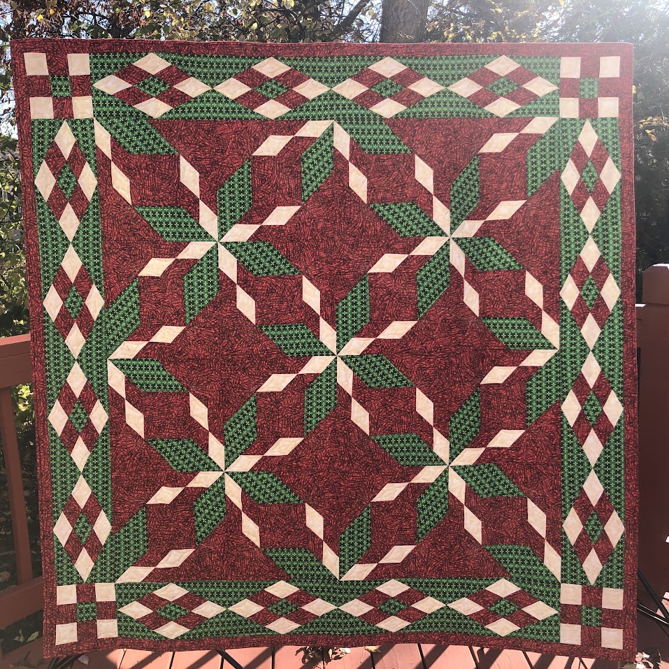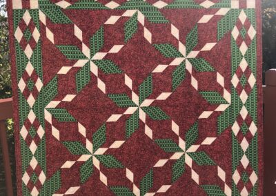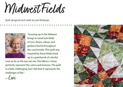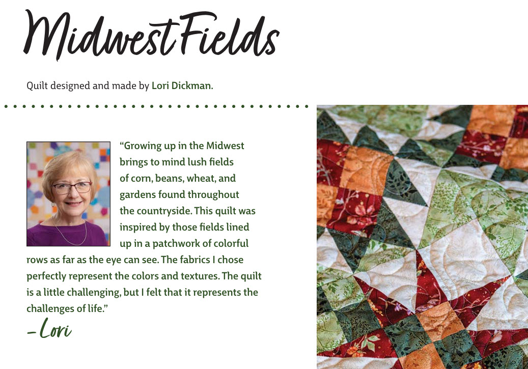 Celebrate timeless tradition with this striking quilt featuring the classic Corn & Beans and Buckwheat blocks – set on point for added visual interest. Growing up in the Midwest brings to Lori’s mind lush fields of corn, beans, wheat and gardens found throughout the countryside. This quilt was inspired by those fields lined up in a patchwork of colorful rows as far as the eye can see. The fabrics I chose perfectly represent the colors and textures. The quilt is a little challenging, but Lori feels that it represents the challenges of life.