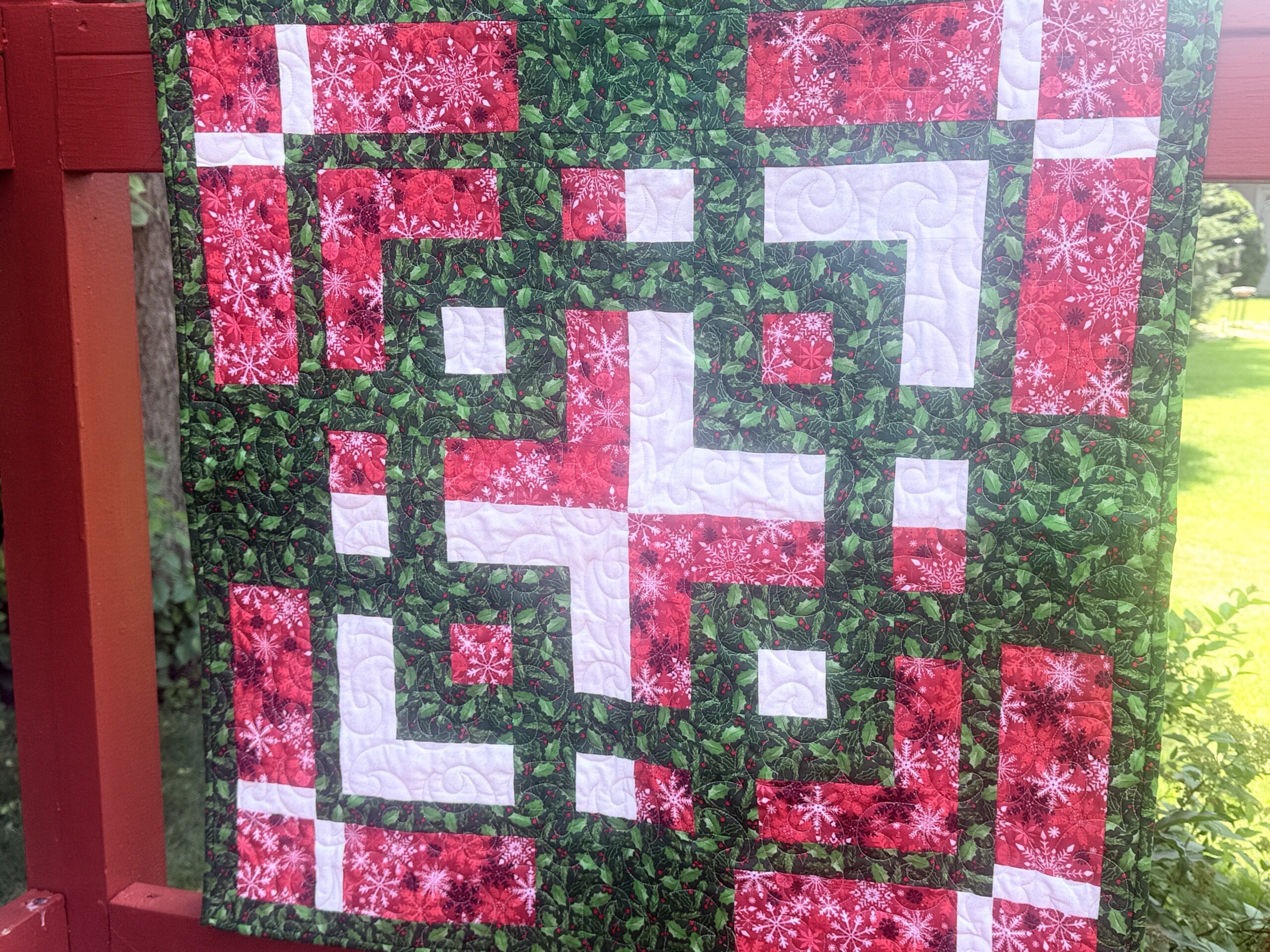 So, not only is there a pattern, “Woven in Time” (which you can find on my website), but there is also a devotional booklet (which is what I shared at the Conference). The Devotional booklet does include Woven in Time patterns at the end for a small wall quilt (30″ square) and a lap quilt pattern (56″ square) as well. The fabrics I used in this Woven in Time pattern are 2.5″ Christmas fabric strips from my stash.
